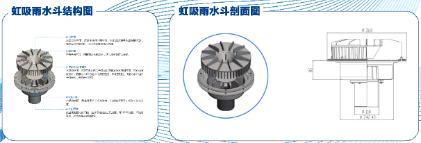 由斗體、導流罩、出水短管、連接壓板和整流器等組成。導流罩是用來攔截樹葉等固體雜物的雨水斗部件,兼有整流作用;整流器是虹吸雨水斗的重要部件,用來疏導水流、 消減旋流和減少空氣進入 雨水斗出水短管;虹吸雨水斗能夠在較小的斗前水深的情況下,達到滿流狀態。我們公司開發的數十種虹吸式雨水斗專利產品,符合《虹吸雨水斗》CJ/T245-2007 國家標準,排水量從 6L/s~120L/s,適用于各種類型的屋面。